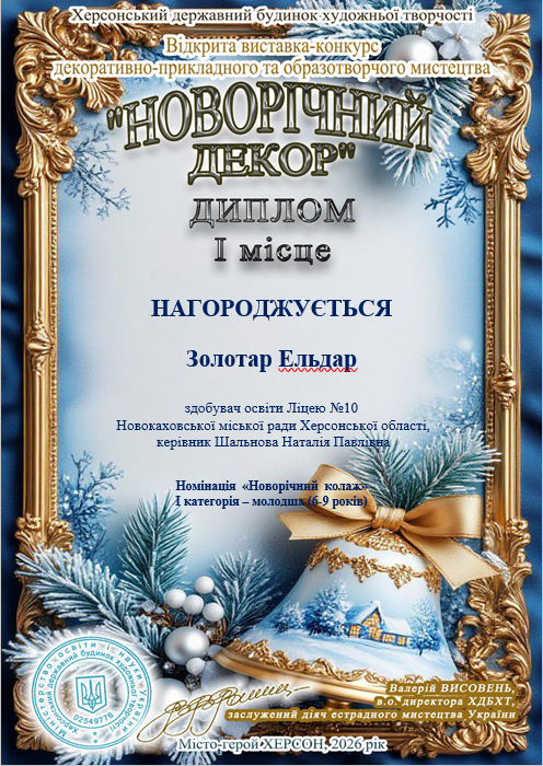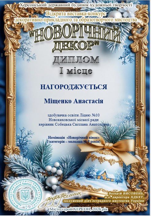Щиро вітаємо переможців відкритої виставки-конкурсу декоративно-прикладного та образотворчого мистецтва «Новорічний декор». Ваша майстерність та творча уява перетворили звичайні матеріали на справжню зимову казку. Ми пишаємося кожним учасником, адже ваші роботи дарують світло та віру в дива, що так важливо сьогодні.